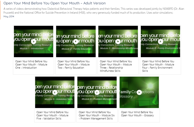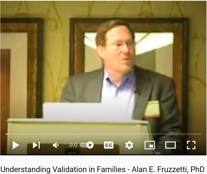 Nous vous invitons à regarder une vidéo d’une conférence de Dr Alan Fruzzetti qui présente cet outil. Dans sa conférence du 18 octobre 2008 à Minneapolis, MN, il explore ce que signifie donner à quelqu’un une réponse validante plutôt qu’une réponse invalidante et comment les réponses validantes peuvent être utilisées pour aider une personne avec des niveaux élevés d’excitation émotionnelle à traiter de manière plus constructive ses sentiments, sa dysrégulation émotionnelle ou son chaos personnel. Dans cette vidéo, le Dr Fruzzetti explique tout l’art de la “validation” et nous montre combien il est facile d’être invalidant. Il explique que l’invalidation n’est pas nécessairement abusive, méchante, négligente, insensible ou dysfonctionnelle – elle peut être bienveillante et bien intentionnée – mais néanmoins douloureuse. Le Dr Fruzzetti recommande que les familles d’une personne ayant un TPL suivent également une thérapie car (1) il est très stressant d’avoir un être cher dans un chaos émotionnel et (2) il est bénéfique pour la personne ayant un TPL que la famille fasse partie de la solution.